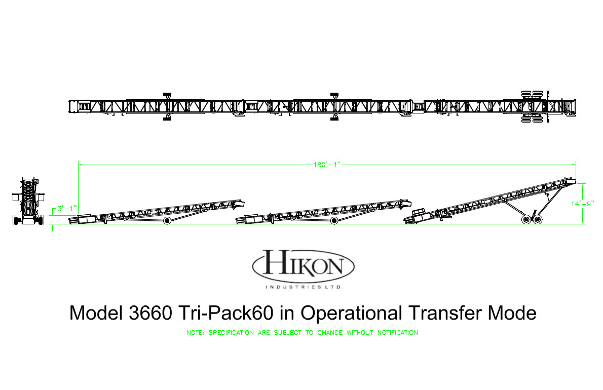 - Top & Middle Conveyors have adjustable height undercarriages C/W Swivel Wheels for Radial Travel